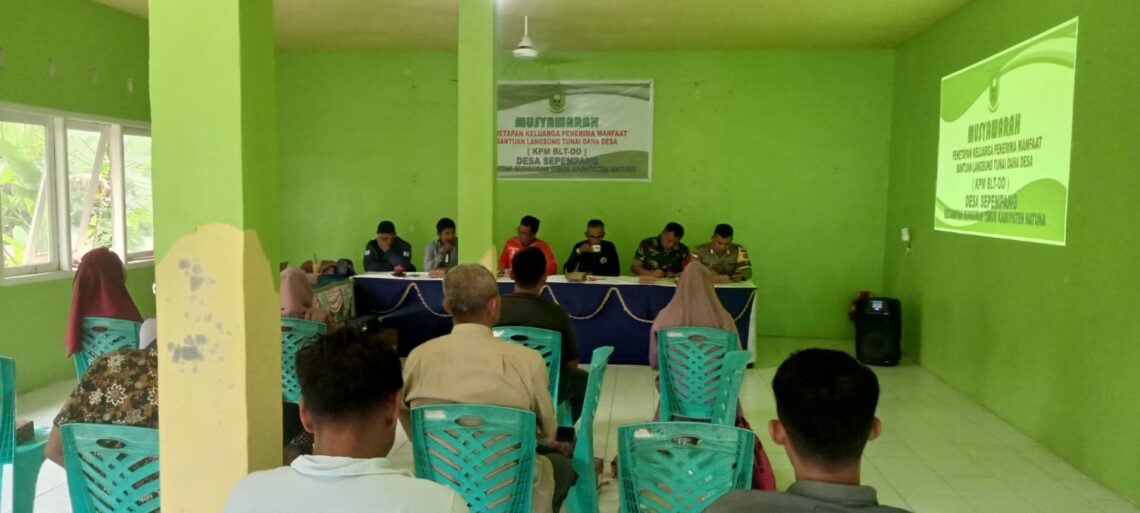 Jum’at, 05 Januari 2024 Pukul 15.15 WIB Pemerintah Desa Sepempang bersama Badan Permusyawaratan Desa (BPD) Desa Sepempang melaksanakan Musyawarah Penetapan Keluarga Penerima Manfaat Bantuan Langsung Tunai Dana Desa (KPM BLT-DD) Tahun Anggaran 2024.