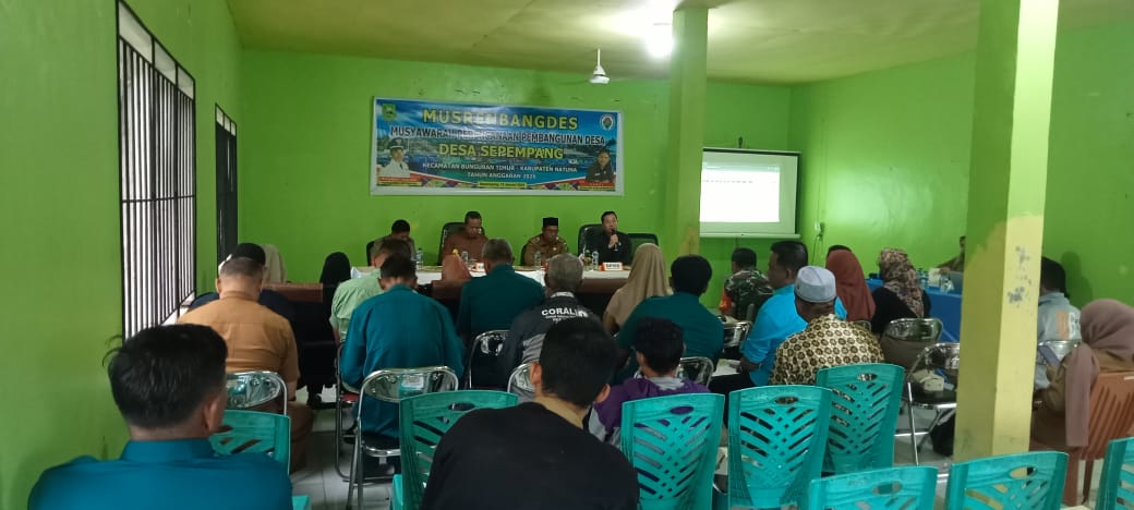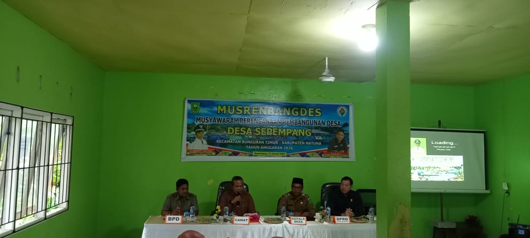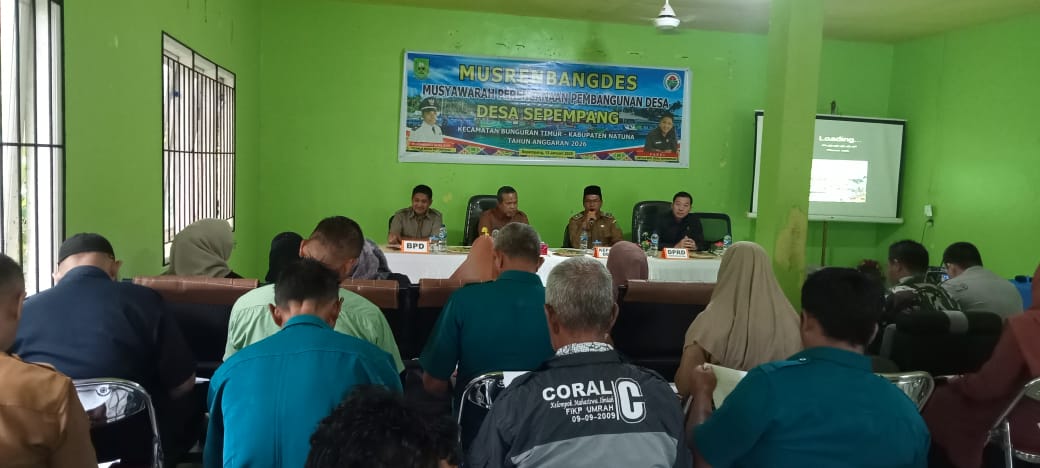 Senin, 13 Januari 2025 Pukul 09.00 WIB Pemerintah Desa Sepempang melaksanakan Kegiatan Musyawarah Rencana Pembangunan Desa (Musrenbangdes) Desa Sepempang Tahun Anggaran 2026. Bertempat di Gedung Rapat Satu Atap Kantor BPD Desa Sepempang, yang turut hadir dalam acara tersebut Camat Bunguran Timur, Kepala Desa Sepempang, Ketua BPD, Anggota DPRD Kabupaten Natuna Dapil I, RT, RW, Dusun, Lembaga serta tamu undangan.