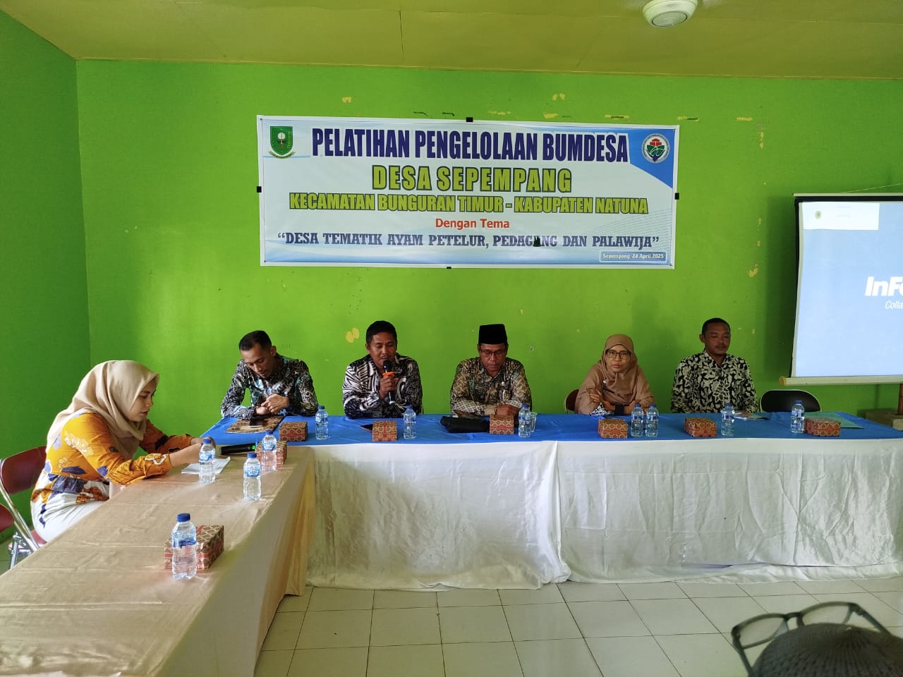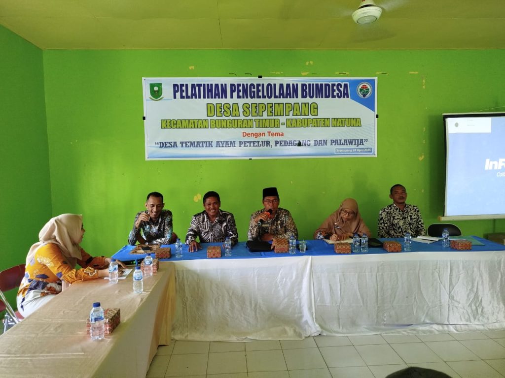 Sepempang, 24 April 2025 — Pemerintah Desa Sepempang menggelar Pelatihan Pengelolaan BUMDes bertema “Desa Tematik Ayam Petelur, Pedaging, dan Palawija”, Kamis (24/4), pukul 08.30 WIB. Kegiatan ini berlangsung di Ruang Rapat Satu Atap BPD Desa Sepempang dan dihadiri oleh Kepala Desa Sepempang, Sekretaris Desa, Ketua dan anggota BPD, narasumber dari Dinas Pemberdayaan Masyarakat dan Desa (PMD) Kabupaten Natuna, Dinas Ketahanan Pangan dan Pertanian, serta peserta pelatihan.