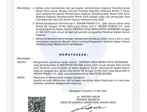 KOPERASI DESA MERAH PUTIH SEPEMPANG RESMI BERBADAN HUKUM