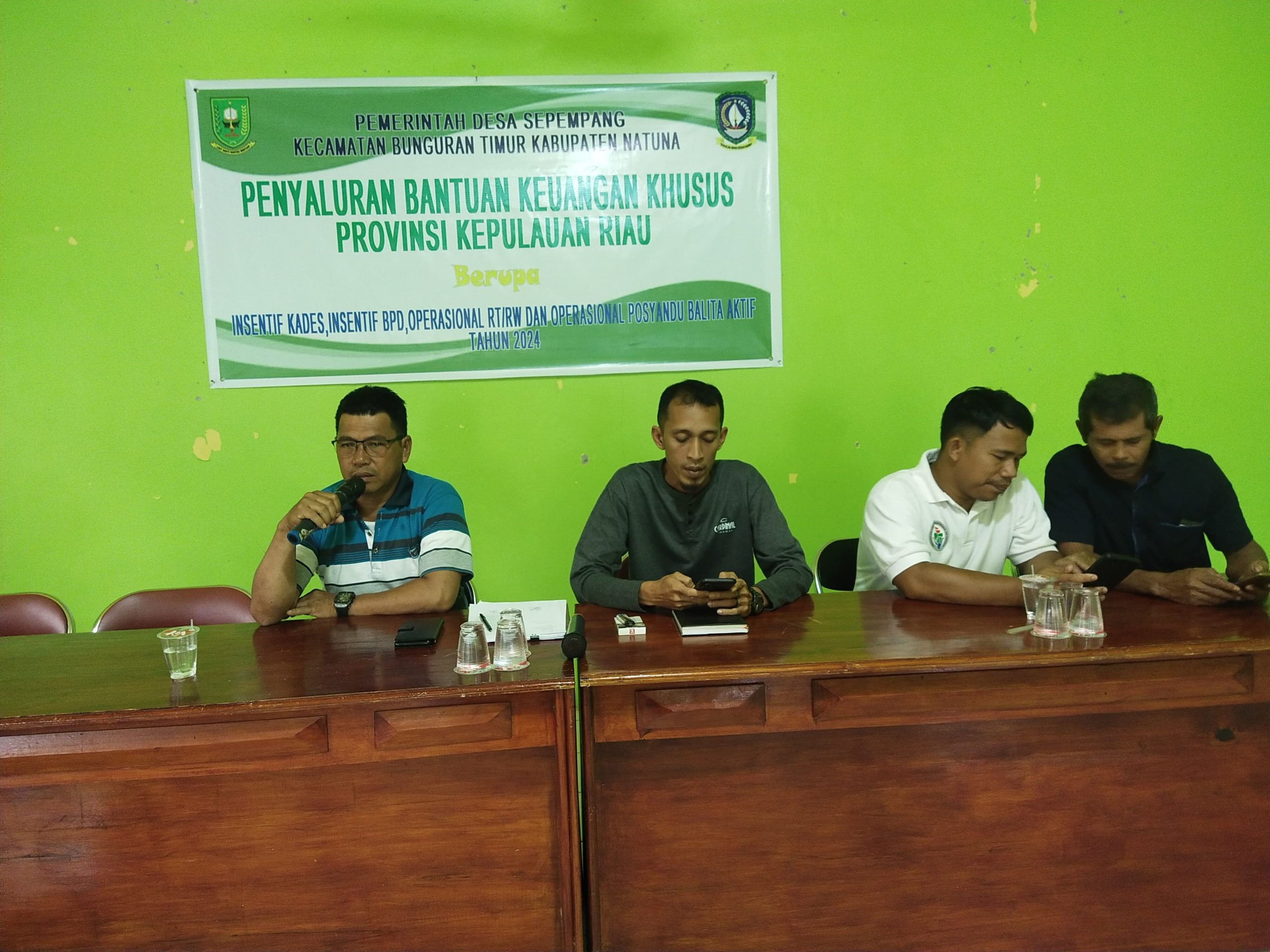 Sambutan Kepala Desa Sepempang (Muhammad Shalihin) beliau menyampaikan pada hari ini kita akan menerima Bantuan Keuangan dari Provinsi Kepri. Yang mendapat Bantuan Keuangan tersebut ialah Kepala Desa, BPD, RT. RW dan Kader Posyandu. Kader Posyandu terbagi 3 yakni Kader Posyandu Balita Cempaka, Posyandu Balita Beringin Jaya, Posyandu Balita Anggrek. Untuk Kepala Desa berupa Operasional Kepala Desa Sebanyak Rp. 6.000.000, Tunjangan BPD sebanyak Rp. 8.000.000, RT dan RW sebanyak Rp. 18.000.000 berupa Operasional RT dan RW, dan Kader Posyandu Sebanyak Rp. 5000.000 setiap Posyandu”Jelasnya.