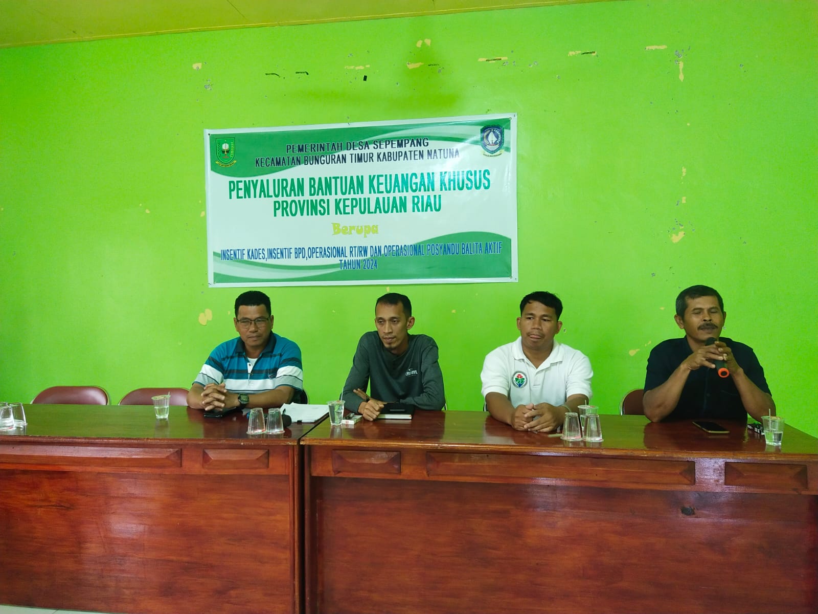 Jum’at, 18 Oktober 2024 Pukul 13.30 WIB Pemerintah Desa Sepempang melaksanakan Penyaluran Bantuan Keuangan Khusus Provinsi Kepulauan Riau. Bertempat Diruang Rapat Satu Atap BPD Desa Sepempang yang dihadiri oleh Kepala Desa Sepempang, Sekretaris Desa Sepempang, BPD Desa Sepempang, Pendamping Desa dan Pendamping Lokal Desa.