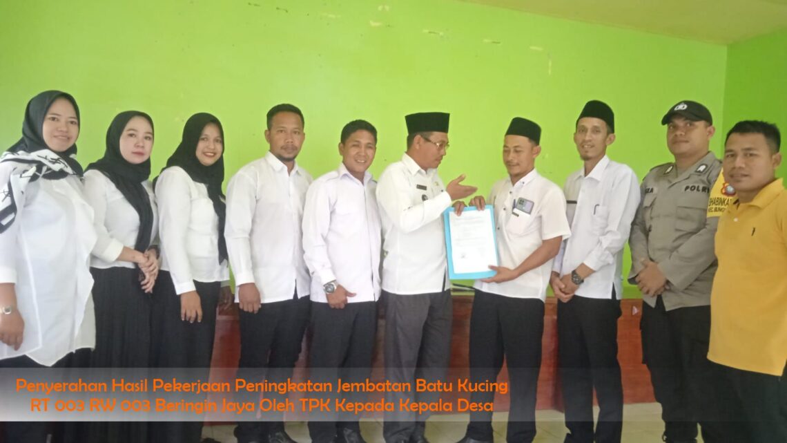 Beliau juga menyampaikan untuk bulan maret sudah dibangun Pembangunan Peningkatan Jembatan Batu Kucing RT.003/RW.003 Beringin Jaya, dimana jembatan tersebut sebagai akses masyarakat untuk beraktivitas seperti kendaraan roda 2 dan roda 4.