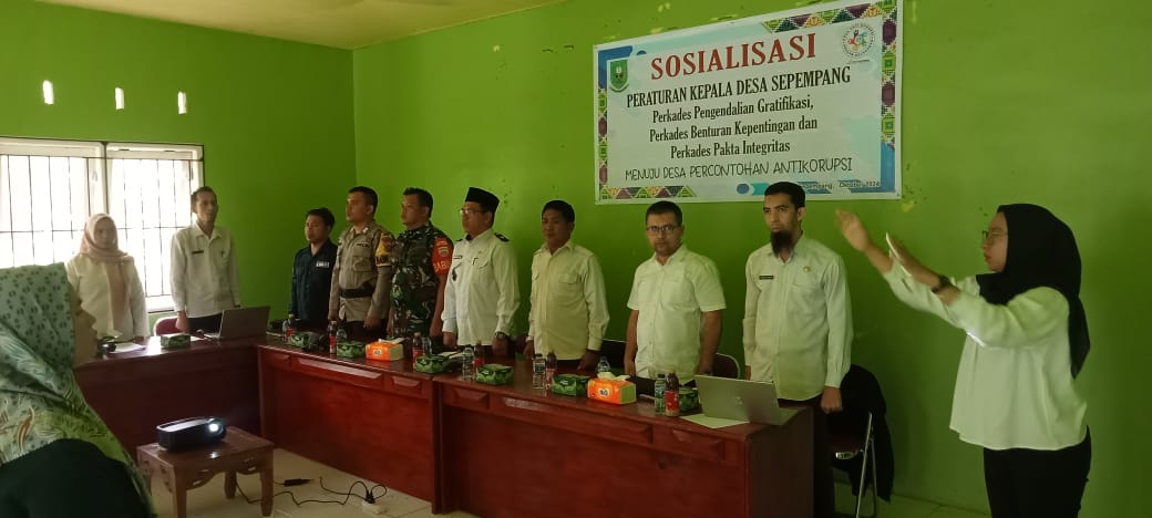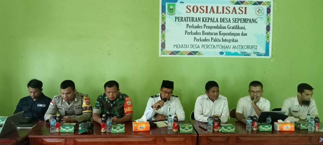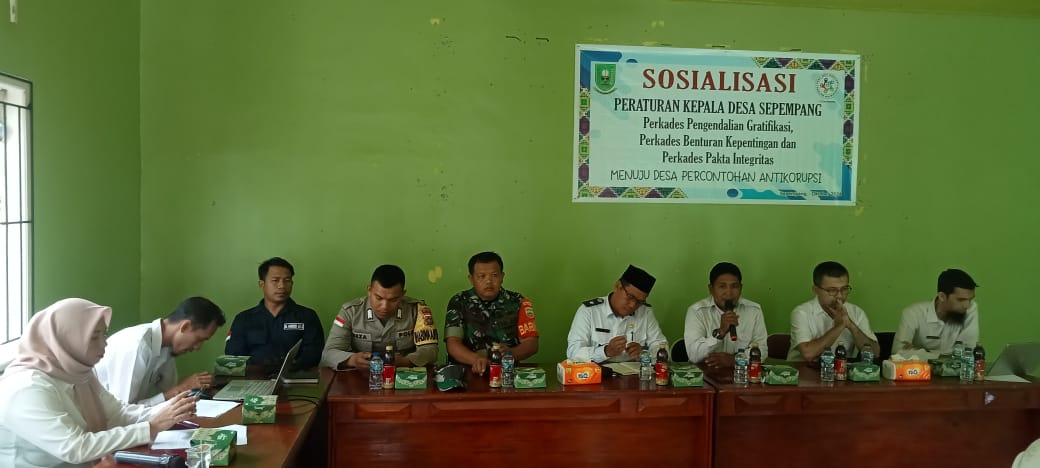 Rabu, 02 Oktober 2024 Pukul 09.00 WIB Pemerintah Desa Sepempang melaksanakan Sosialisasi Peraturan Kepala Desa Sepempang (Perkades Pengendalian Gratifikasi, Perkades Benturan Kepentingan dan Perkades Pakta integritas tahun 2024. Bertempat diruang Rapat Satu Atap BPD Desa Sepempang, yang dihadiri oleh Kepala Desa Sepempang, Sekretaris Desa Sepempang, Ketua BPD beserta anggota, Aparatur Desa Sepempang, Narasumber Dari Inspektorat, Pendamping Desa, Babinsa, Bhabinkamtimas, Dusun, RT, RW, Tokoh Agama dan Lembaga Desa Sepempang.